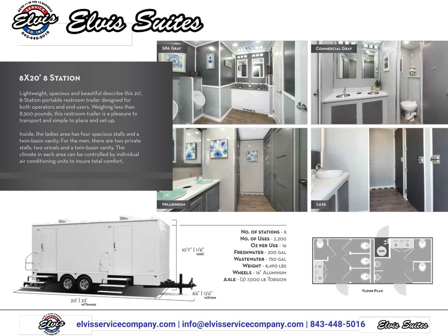 This trailer comes with a 680 gallon waste holding tank, maximum 8 occupancy, and is 8′ wide X 19′ long.