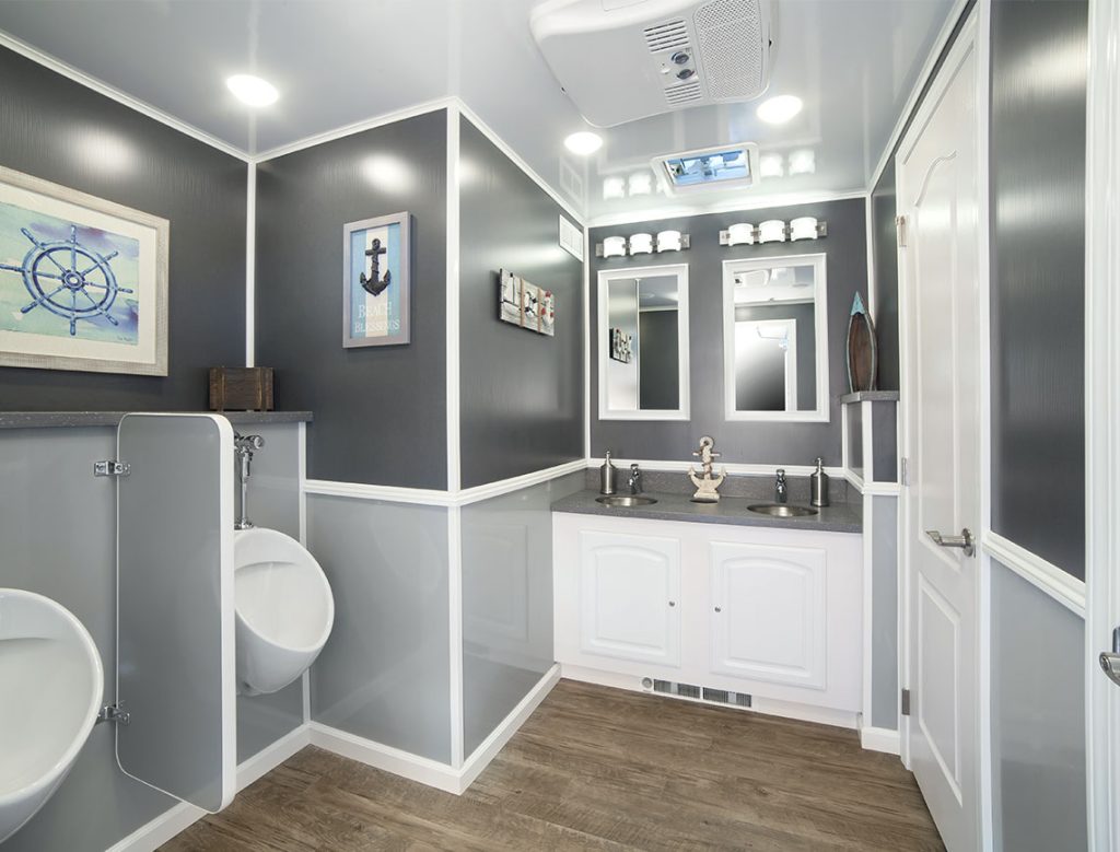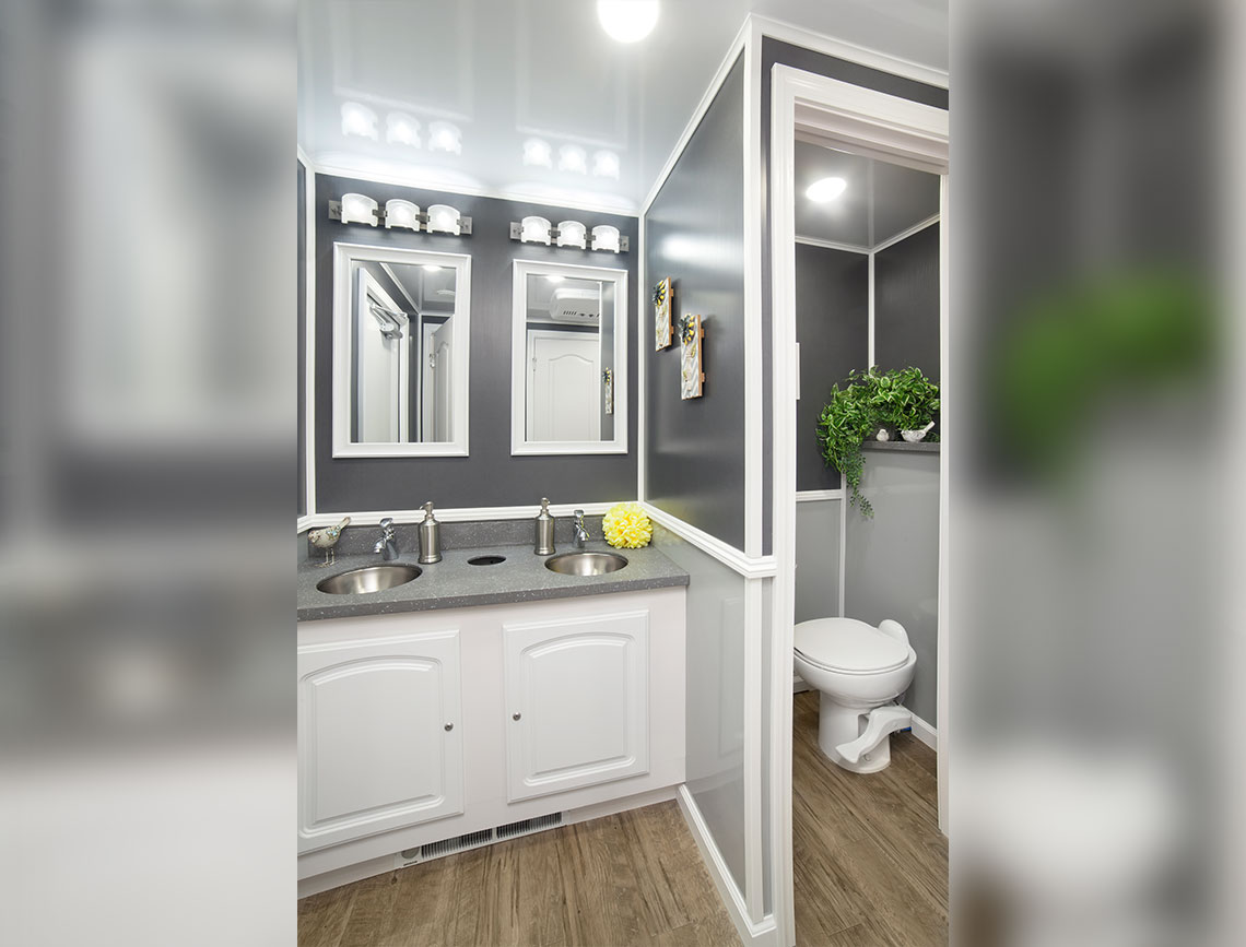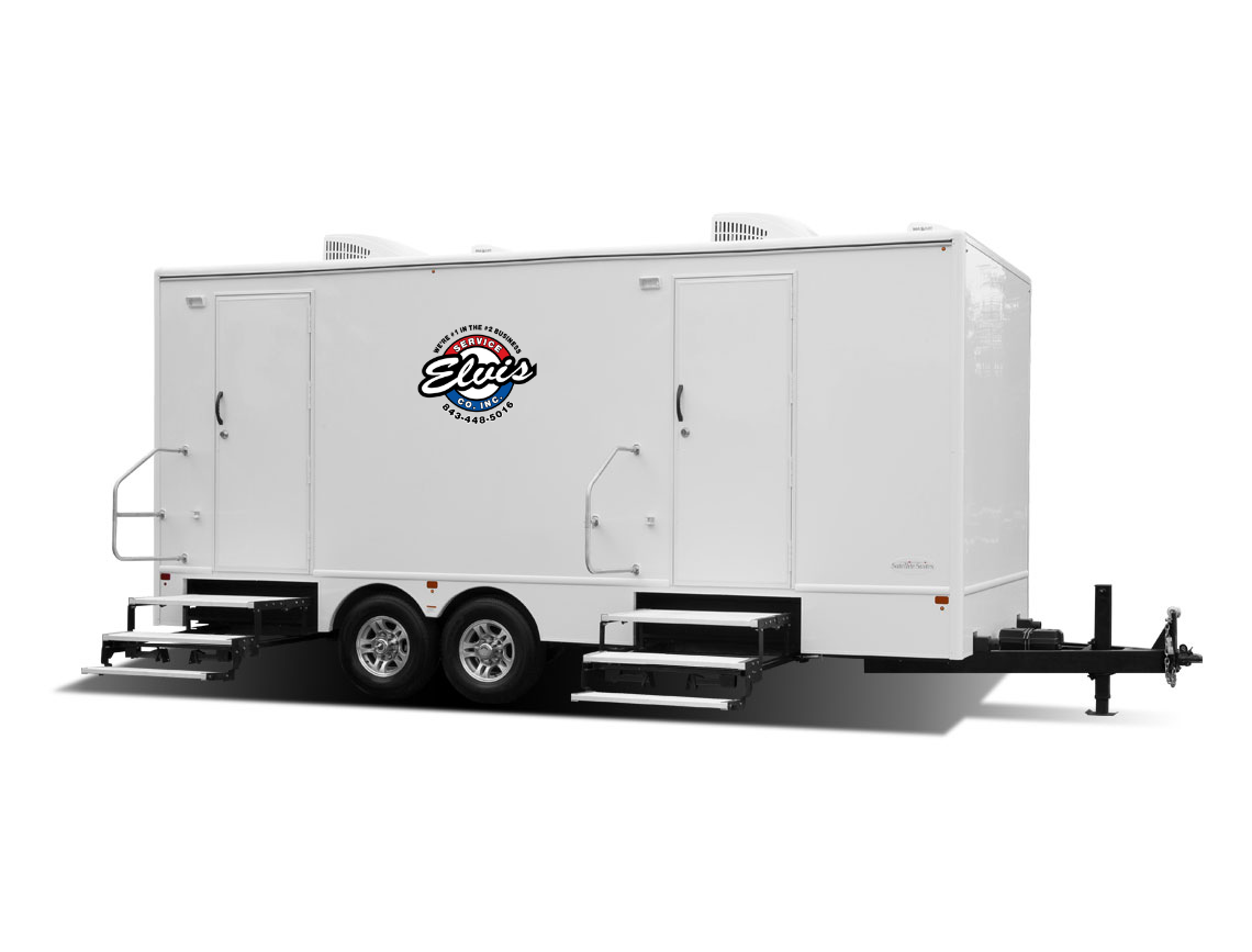 It is perfect for larger weddings or events, and comes equipped with air conditioning, flushing toilets, radio/cd player/aux input. This portable restroom trailer comfort stations makes any guest feel like they are in the comforts of home.