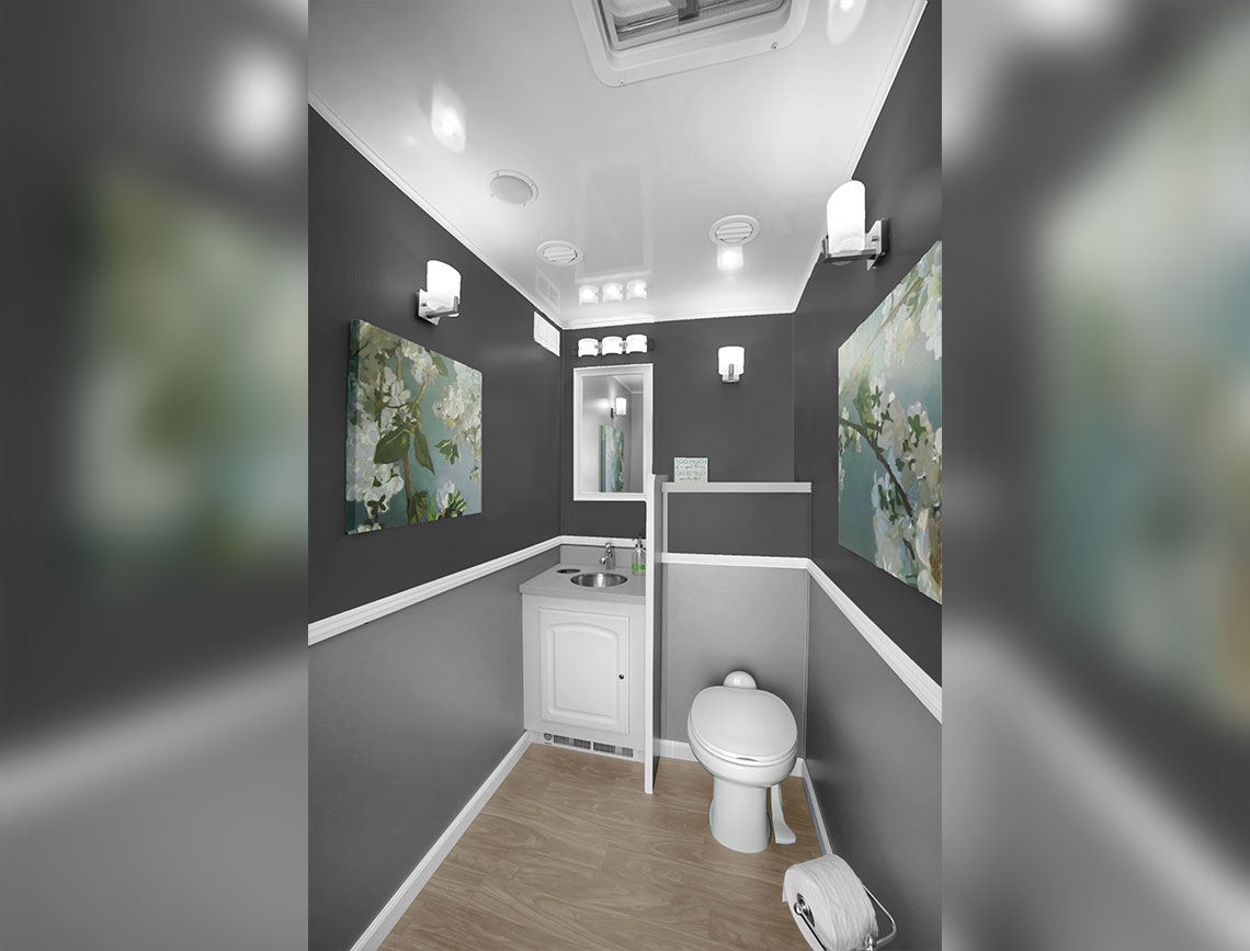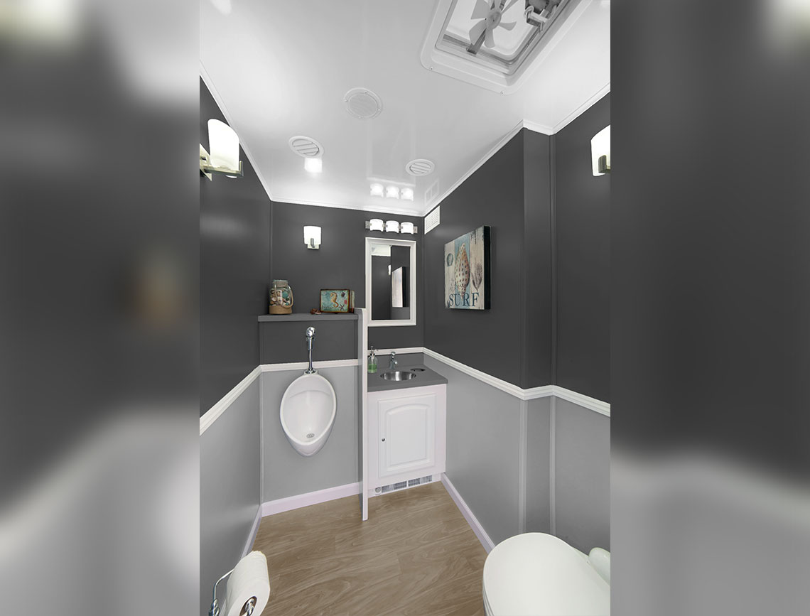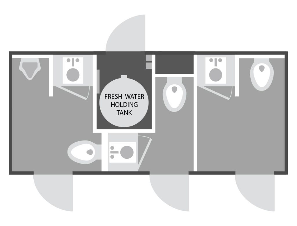 The 16-foot restroom trailer targets larger gatherings with its three restrooms and extra large 430 gallon holding tank. Perfect for weddings, golf outings, corporate functions, and other upscale events. This bathroom trailer is perfect for weddings in Myrtle Beach, SC.